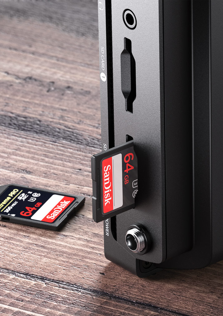 Для сохранения материала на мониторах-рекордерах используются как обычные карты памяти SD, так и более скоростные UHS-II. На 7-дюймовой модели предусмотрено два слота, что позволяет заменять полный носитель непосредственно во время записи. Благодаря небольшому размеру, высокой скорости передачи данных и доступной цене накопители SD и UHS-II идеально подходят для сохранения трансляций.