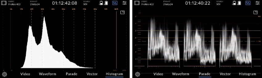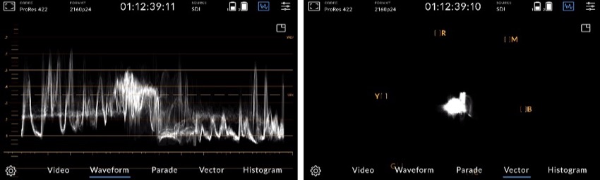 Video Assist имеет целый ряд инструментов для технической проверки видео на соответствие вещательным стандартам и может легко использоваться в мобильных условиях. Форма волны служит для контроля яркости на входе или при воспроизведении, а вектороскоп позволяет установить интенсивность цвета при контрольном значении 100%. Дисплей RGB предназначен для выявления некорректных уровней, в то время как гистограмма показывает распределение элементов изображения от белого к черному для обнаружения утраты деталей в областях света и тени. Встроенные индикаторы легко отключить во время эфирной работы или выводить как картинка в картинке в верхнем правом углу экрана.